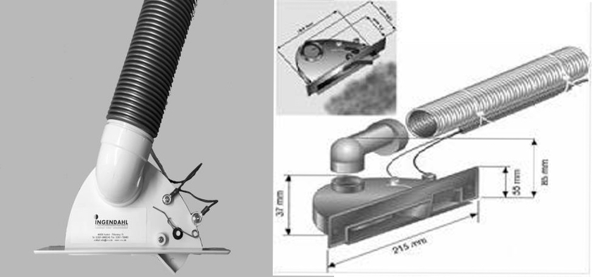 Für den Einbau der saugenden Kehrschaufel ist ein flexibles Rohr und ein kurzer 90° Bogen am besten geeignet. Hier empfehlen wir das Kehrschaufel Set. Das flexible Rohr lässt sich anschließend mit einem Verbindungsstück an dem weiterführenden Bogen oder der Abzweigung fixieren. Für die Weiterführung mit 2“ Rohr benötigen Sie einen kurzen 90° Bogen für die Kehrschaufel. Der 90° Bogen darf nur auf die saugende Kehrschaufel gesteckt, nicht geklebt werden, damit eine spätere Demontage möglich ist. In die Sockelleiste ist eine Aussparung von 165mm Breite und 37mm Höhe anzubringen