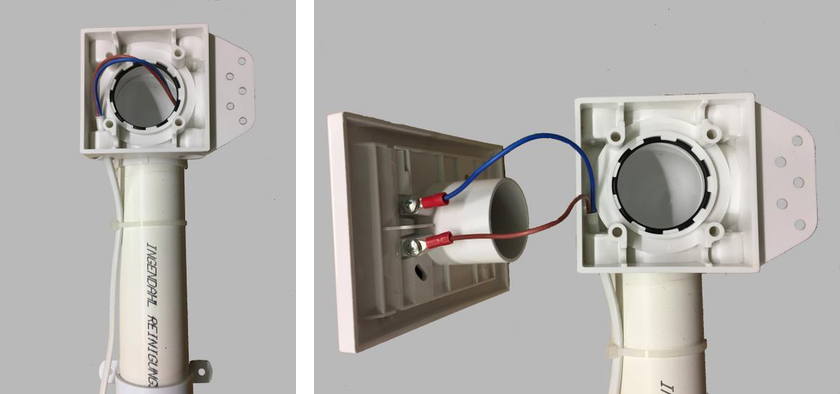 Die Steuerleitung ziehen Sie durch eine zu durchbrechende Aussparung, ca. 10 cm aus dem Montagerahmen. Wird die Saugsteckdose später montiert, steck en Sie die Steuerleitung in die Saugöffnung des Montagerahmens und verschließen Sie diesen mit dem Putzdeckel. Nach dem Verputzen kann dann die Saugsteckdose angeschlossen und montiert werden. Entfernen Sie den Putzdeckel vom Montagerahmen und ziehen Sie die Steuerleitung aus dem 90° Bogen heraus.